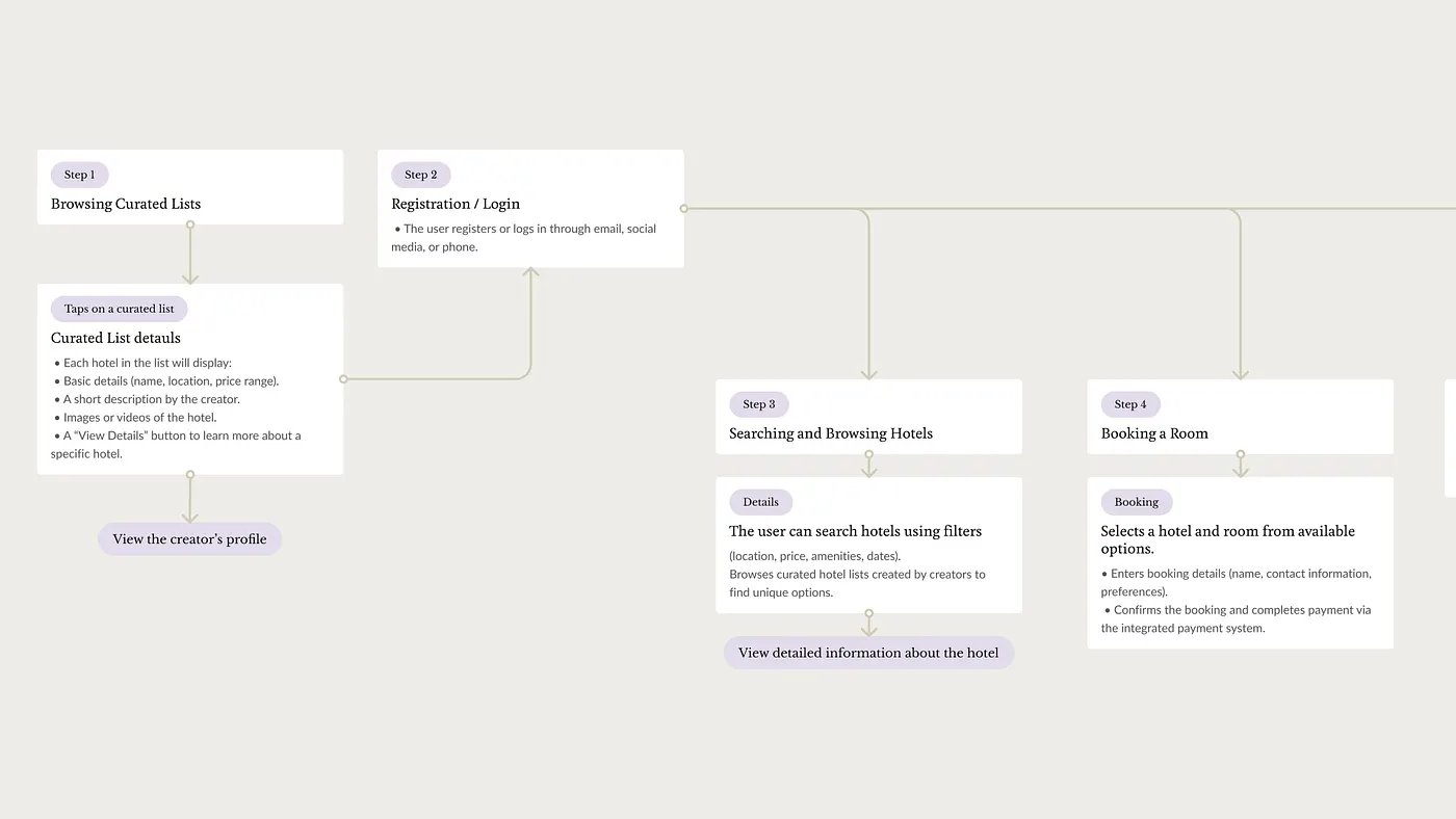 The user experience needs to be intuitive at every step. Travelers should have a smooth journey—from inspiration to booking—built on recommendations they trust. Creators need an easy way to curate and share their favorite stays while tracking their earnings. Hoteliers require real-time analytics to see how creator-driven bookings impact their business. With these needs in mind, we design a user journey that isn’t just functional but effortless.