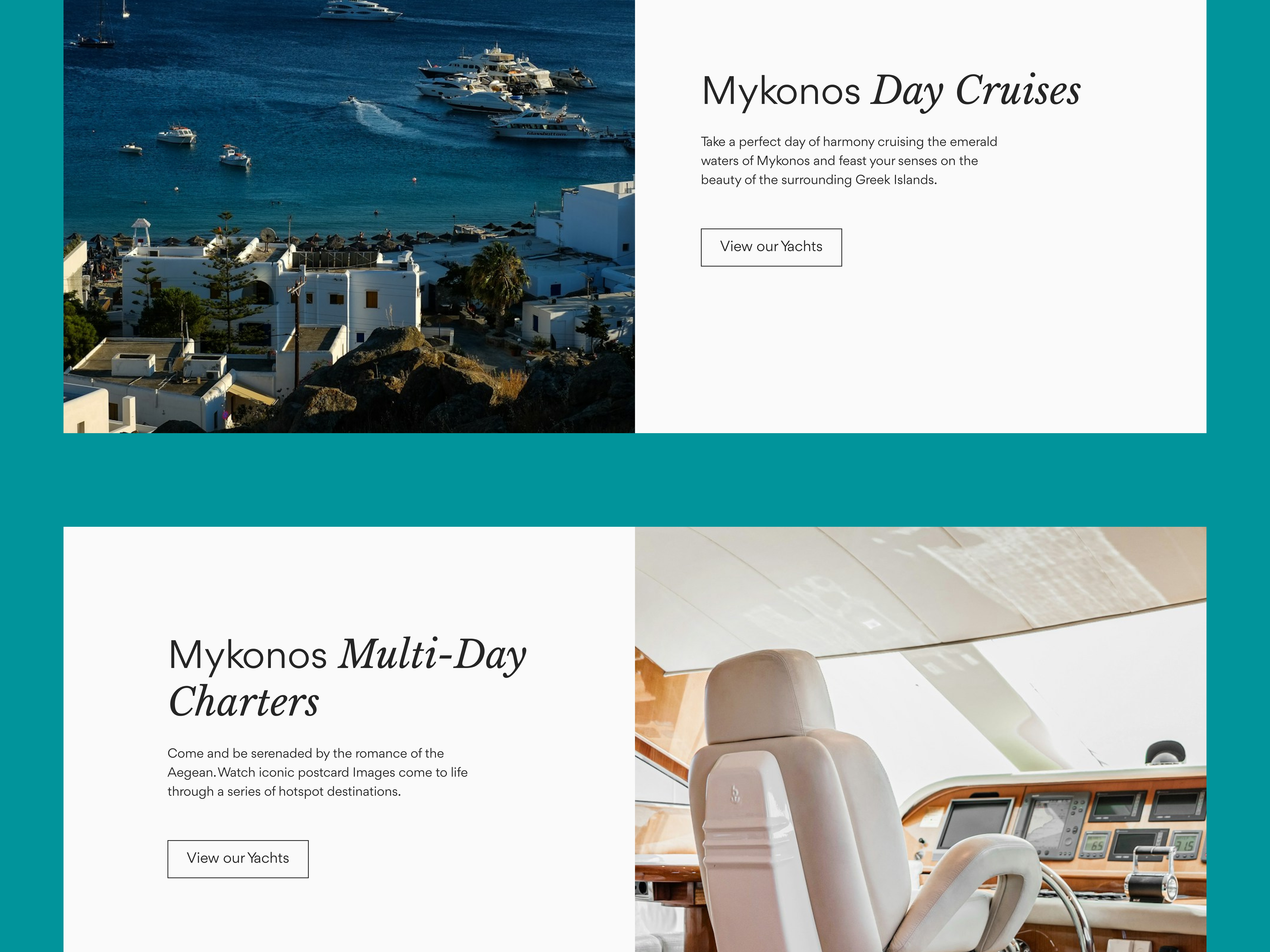 Mykonos Yachts is a luxury yacht charter company based on the island of Mykonos, offering premium day cruises, multi-day charters, and a curated fleet of high-end yachts. The brand is built around exclusivity, elegance, and a refined travel experience — and the website needed to reflect exactly that.